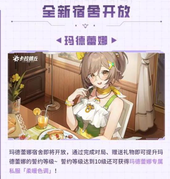 此外,游戏中还将开放“玛德蕾娜”全新宿舍,玩家可以通过完成对局、赠送礼物提升玛德蕾娜的誓约等级,达到10级时更可获得她的专属私服“柔暖色调”。