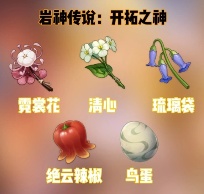 ⓷ 岩神传说 - 开拓之神:霓裳花、清心、琉璃袋、绝云辣椒、鸟蛋
