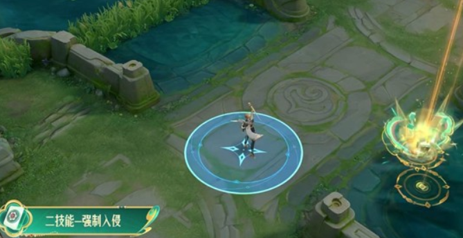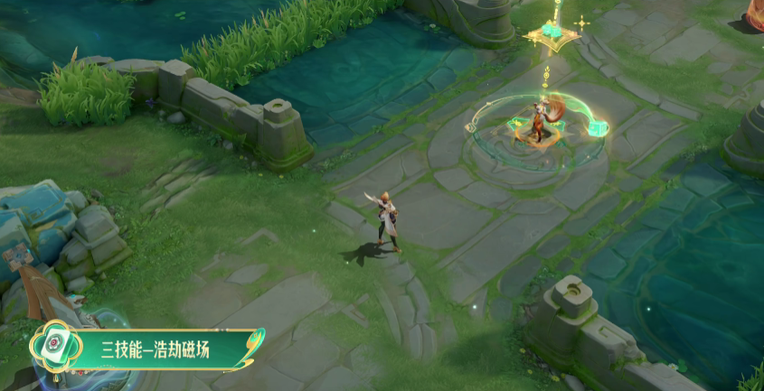二技能在释放点绘制“一筒”花纹,召唤两个拖曳青云的麻将机关人下落,触发彩色粒子爆炸。