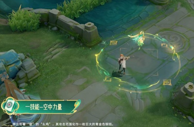 普攻发射铜钱+麻将组成的金色射线,青云纹环绕弹道。一技能掷出衔“發”字幺鸡,落地化作青金色铜钱范围,二阶段幺鸡分裂为二,铜钱直径扩大,青云升腾。