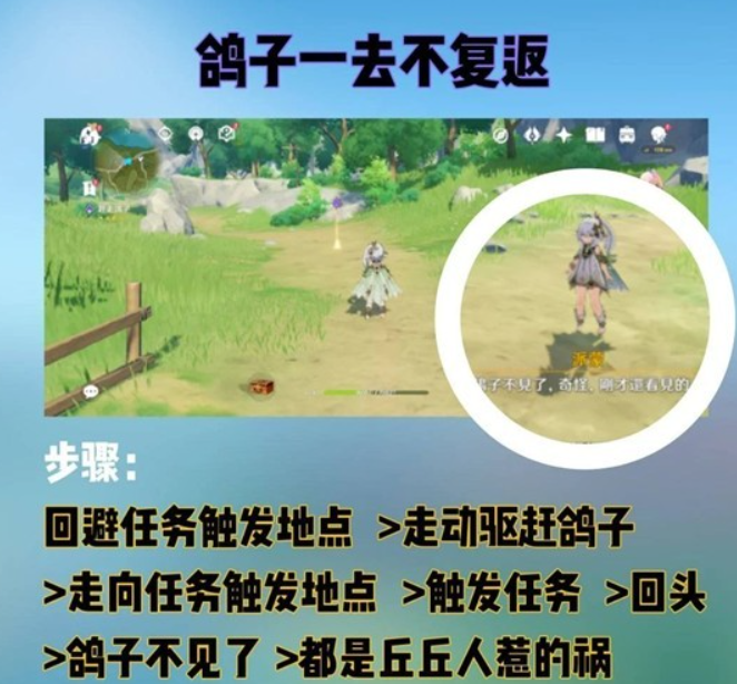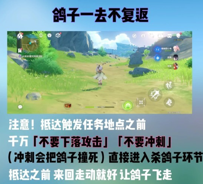 进入黄圈以前,确保自己是走动过去赶跑鸽子(不要下落攻击,不要冲刺),才能触发到丘丘人营地!不然会直接结束该任务喔!