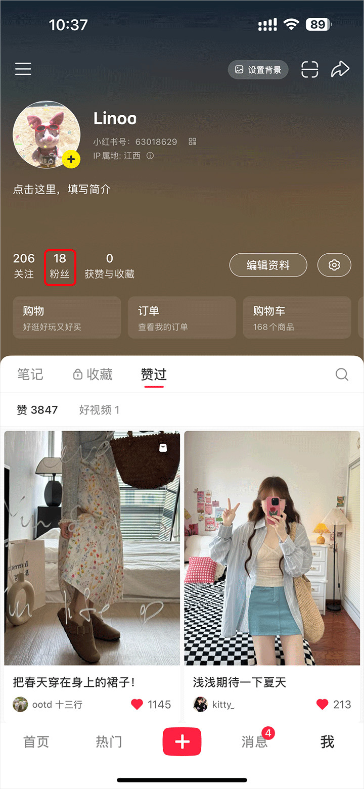 点开“我”点击“粉丝”可以注意下,此时是18个粉丝