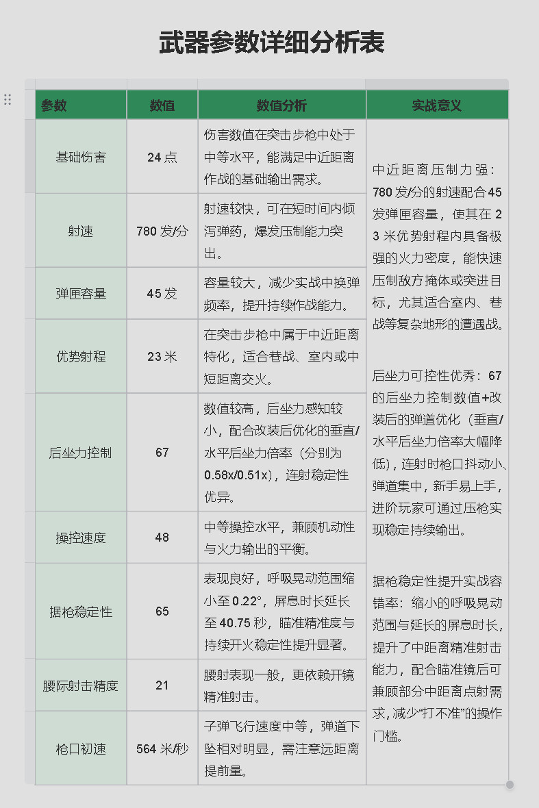 适合玩家:新手/进阶玩家:后坐力控制与稳定性优异,操作门槛低,新手能快速掌握射击节奏;进阶玩家可利用高射速和弹道集中特性,在近战中发挥火力压制优势。