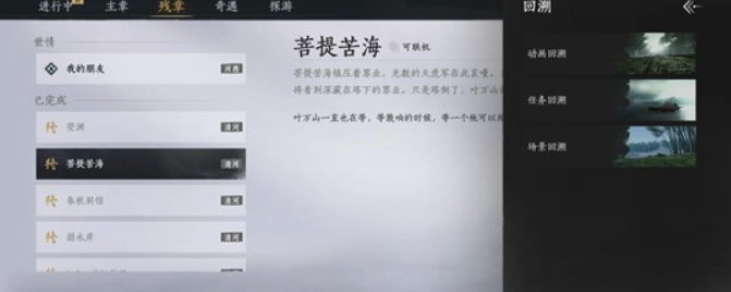 任务栏中选择 【残章】,点击【菩提苦海】,选择【任务回溯】