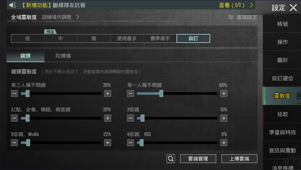 再谈谈瞄准技巧,灵敏度是关键,建议先在配对玩法中多打几局,慢慢调整各种倍镜及枪枝的压枪及视角转换,设定一组最适合你的灵敏度,别人给的灵敏度设定不一定适合你,因此我不建议随便套用别人的灵敏度设定。