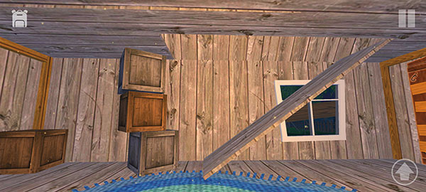 7、开始探索房间,发现楼顶的木板是碎的,可以利用背后的木箱子爬上去。